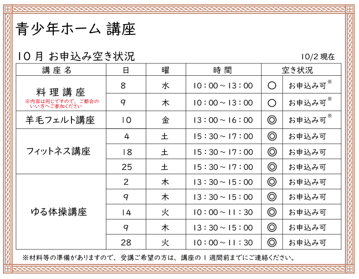 周東勤労青少年ホーム 10月の講座受講状況を知らせします。