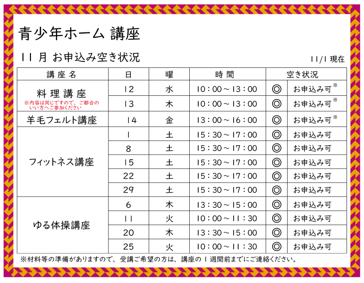 勤労青少年ホーム講座(11月) 2025年11月1日 最終更新日時 : 2025年10月31日 パストラルホール管理者 周東勤労青少年ホーム 11月の講座受講状況を知らせします。 11月受講状況 周東勤労青少年ホーム 開館時間/8:30~22:00 NEWS 施設案内 アクセス お問合せ